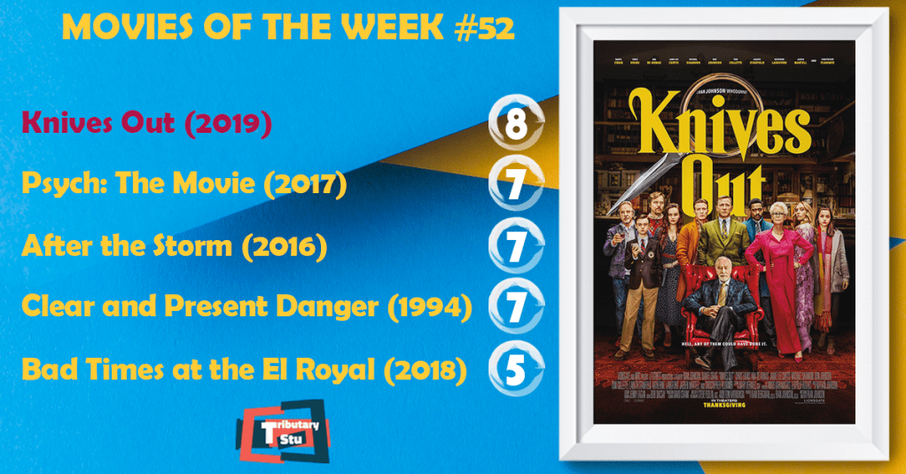 Knives Out (2019): If you’re an Agatha Christie fan, this flick written and directed by Rian Johnson (Brick, Looper and Star Wars VIII) is an absolute treat. With a deliciously over-the-top performance from Daniel Craig as ingenue private detective Benoit Blanc, it’s a whodunit with a twist – the viewer finds out the would-be-murderer early on, which then turns the movie on its head. The high-profile cast (Toni Colette, Michael Shannon, Jamie Lee Curtis, Don Johnson, Chris Evans and Christopher Plummer) forms a family of dysfunctional would-be-heirs to the estate of successful writer of detective mystery stories, Harlan Thrombey (Plummer), whose death occurs in the first scene of the film. They all play second fiddle to Marta Cabrera (Ana de Armas), the Ecuadorian-Paraguayan-Uruguayan-Brazilian, salt-of-the-earth house nurse to the deceased, whose physical inability to tell a lie makes for a fun gimmick in unfolding the truth. As you would expect, there will be twists, turns and suspense, in this perfectly executed murder-mystery story of, really, a different age. 8/10
