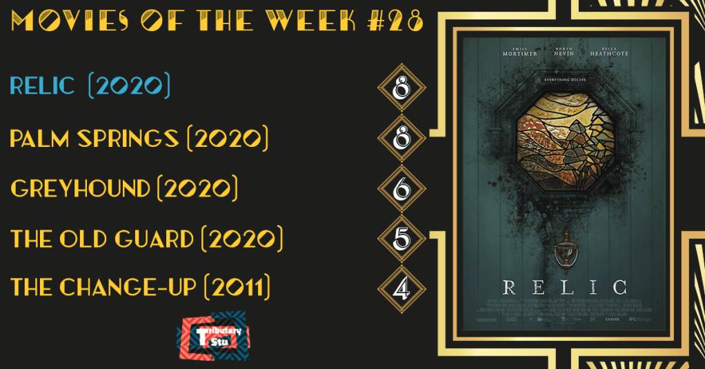 Relic (2020): Whether you are into horror movies or not, Relic is bound to creep you out and send you into a spiral of dark thoughts. Natalia Erika James’ movie, wherein a mother and daughter go to check onto grandma, speaks uncomfortable volumes about how the degradation (not to call it “aging”) of our loved ones is one of the most difficult realizations that we will have to make as adults. While a bit of a slow burner, low on scares, but consistent in uncomfortable hair-raising moments, I found it to be rewarding and challenging in equal measure, with a satisfyingly vague and ponderous conclusion. Because it’s hard not to compare, Relic hit closer to home for me than Hereditary (2018). 8/10