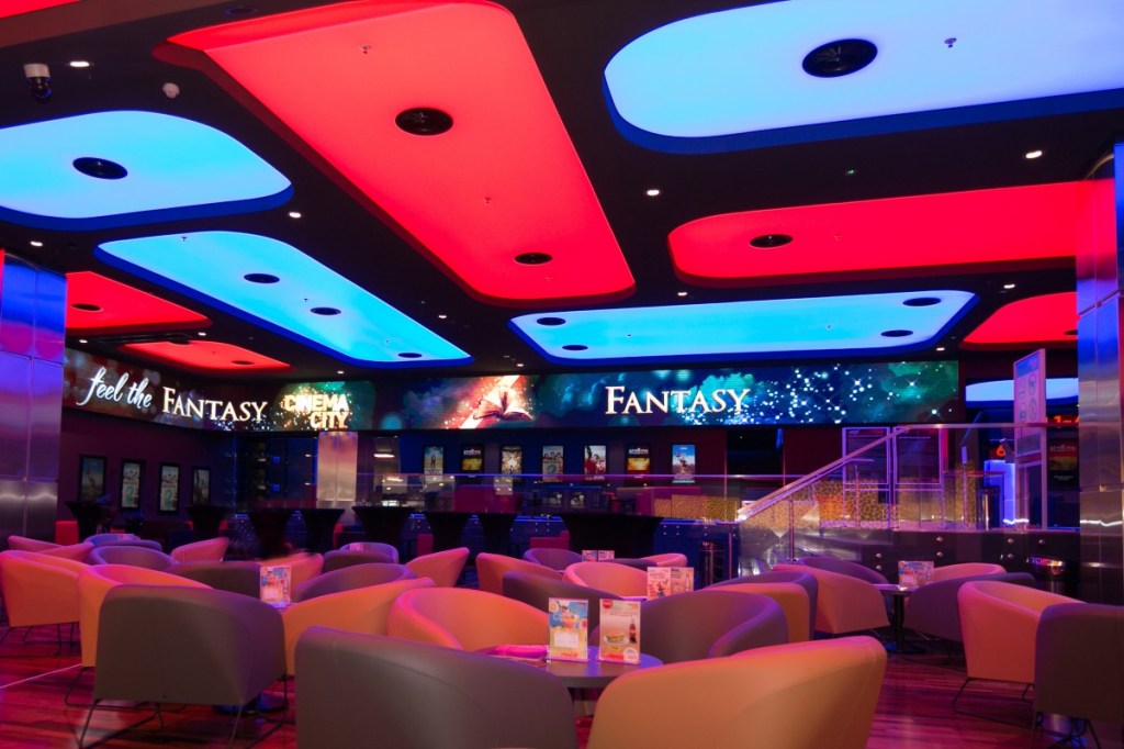 The cinema greets you with an cordoned-off maze for queue management, next to a generous open lounge. You’ve got seats on the sides, as well as a slightly friendlier and very colorful seating area next to the ice-cream/coffee point. Above the snacks counter and all the way towards the entrance, there’s a digital display to tease your blockbuster action taste buds. This can all get pretty lively, but it’s very rarely so when I’m there. The busier weekday is Tuesday, due to the all day discount offer CC have going, but other than that, it’s mighty chill.